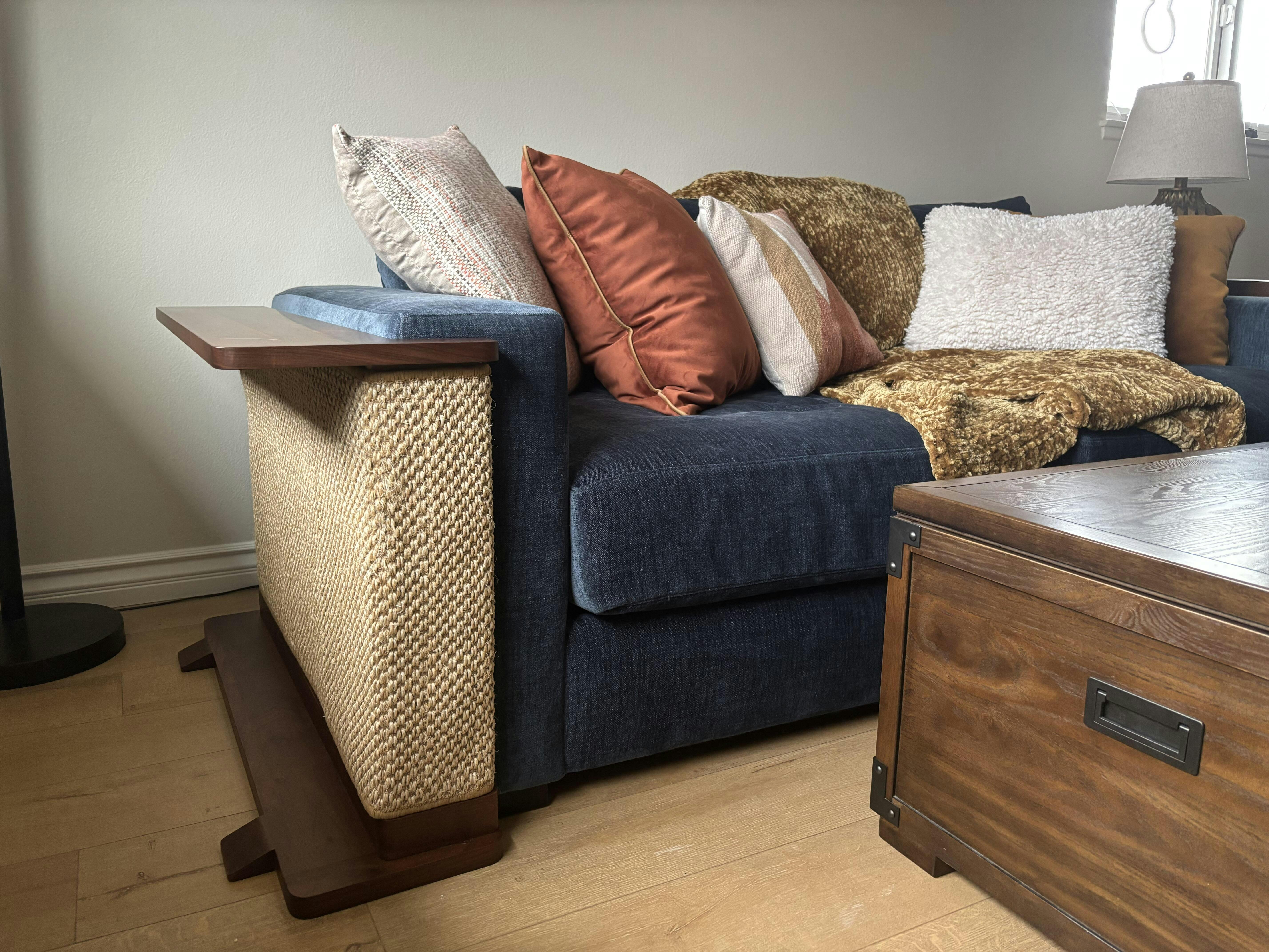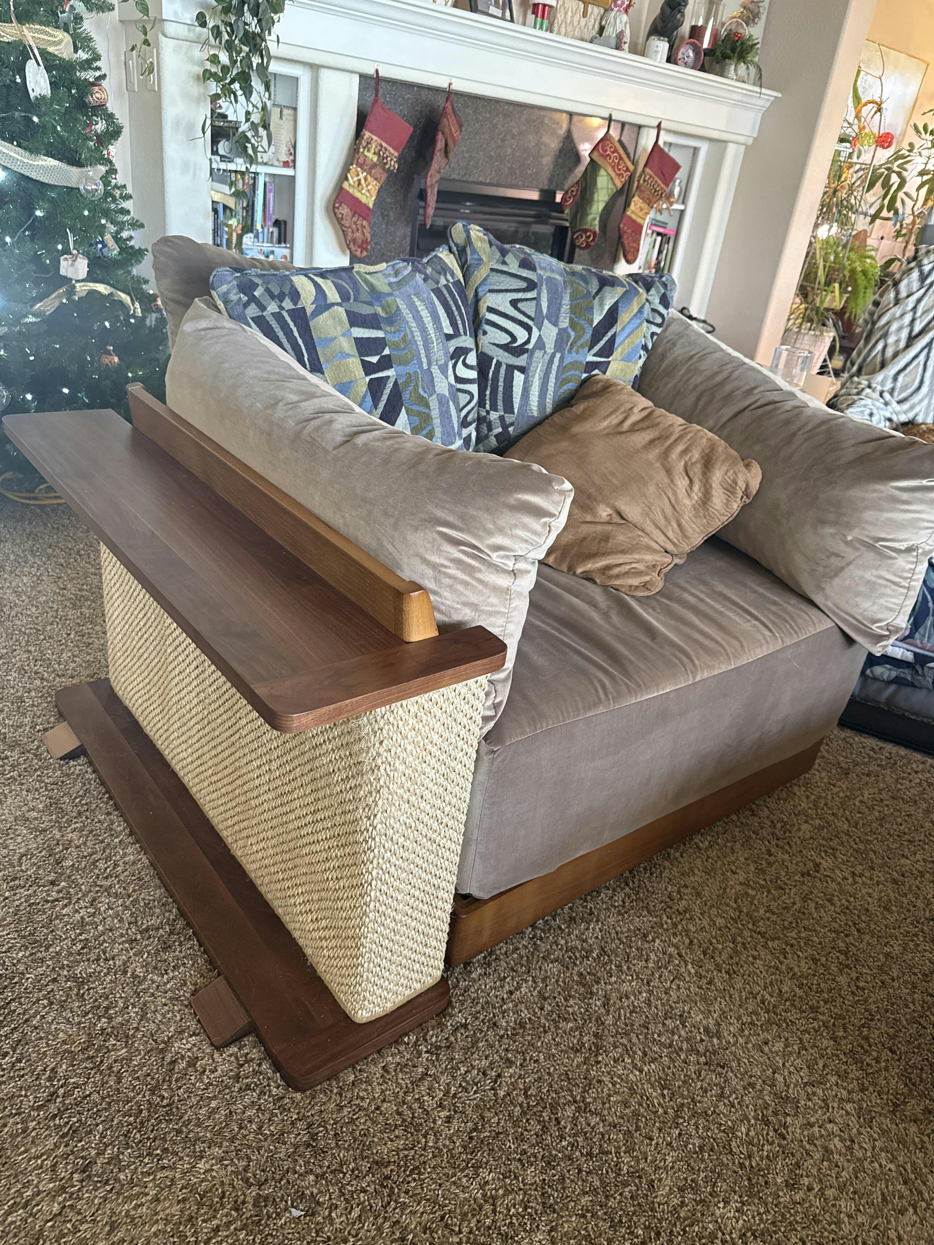 Our sectional doesn’t have traditional arms so we placed it around the back corner. Our cats haven’t used it yet, but I am so impressed with the quality of materials. It was super simple to put together and sturdy, I can tell it will last us a long time. I’m excited to have a piece of cat furniture that looks modern and doesn’t stick out like a sore thumb in our living room.